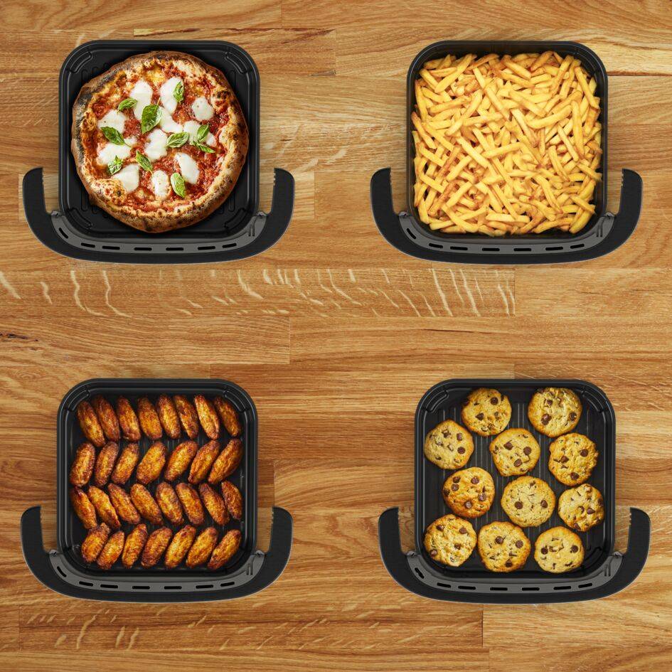 SUPERFICIE DE COCCIÓN DE GRAN TAMAÑO: en la espaciosa cesta caben hasta 1 kg de patatas fritas, 25 muslitos de pollo, pizzas de hasta 27 cm, 6 filetes de pescado, 12 galletas, 30 nuggets, 10 lonchas de bacon, etc. DISEÑO COMPACTO: diseño cuadrado pensado para optimizar espacio en la encimera, lo que ofrece tanto estilo como funcionalidad sin utilizar demasiado espacio VERSÁTIL: esta freidora de aire XL cocina una gran variedad de alimentos velozmente, con una espaciosa cesta cuadrada para generosas cantidades de patatas fritas, muslos, pizza, filetes de pescado, galletas, nuggets y mucho más TECNOLOGÍA EXTRA-CRISP: la tecnología de fritura por aire Tefal Extra-Crisp, que incluye calentadores superior e inferior combinados con una circulación de aire caliente de 360 °, garantiza unos resultados crujientes y apetitosos que están listos en un momento VENTANA DE VISUALIZACIÓN PARA UNA FÁCIL SUPERVISIÓN: utiliza la práctica ventana de visualización para controlar el progreso de la cocción sin abrir la cesta, para obtener siempre resultados idóneos PANEL DIGITAL: un producto fácil de usar equipado con un panel de control digital intuitivo para ajustar fácilmente el programa, la temperatura y el tiempo de cocción ÓPTIMIZA TIEMPO Y ENERGÍA: fritura de aire eficiente que consume hasta un 70 % menos de electricidad* y cocina un X % más veloz en comparación con los hornos tradicionales (* pruebas realizadas en 2024 con patatas fritas congeladas) EXPERIENCIA PERSONALIZADA: disfruta de una experiencia personalizada cuando uses tu Easy Fry gracias a la aplicación My Tefal, con recetas a medida y mucho más! ¿QUÉ HAY EN LA CAJA?: freidora de aire 15 AÑOS DE REPARABILIDAD: recambios asequibles en nuestros 6200 centros de reparación en todo el mundo, para que puedas reparar tu producto rápidamente durante muchos años, como parte de nuestro compromiso con el medioambiente y la reducción de residuos