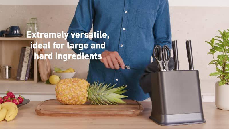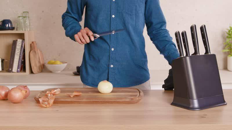 La tecnología patentada EverSharp de Tefal actúa oculta en el bloque. ¿Cómo funciona? Basta con guardar el cuchillo en el interior del bloque después de usarlo. Volverá a estar afilado, en el ángulo correcto, gracias a un sistema de guías de doble V. Tu cuchillo quedará afilado de arriba abajo gracias a las varillas pivotantes de cerámica, que ejercen una presión óptima y constante para un afilado duradero.