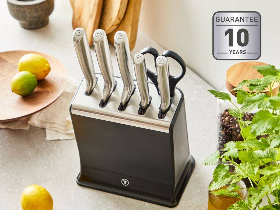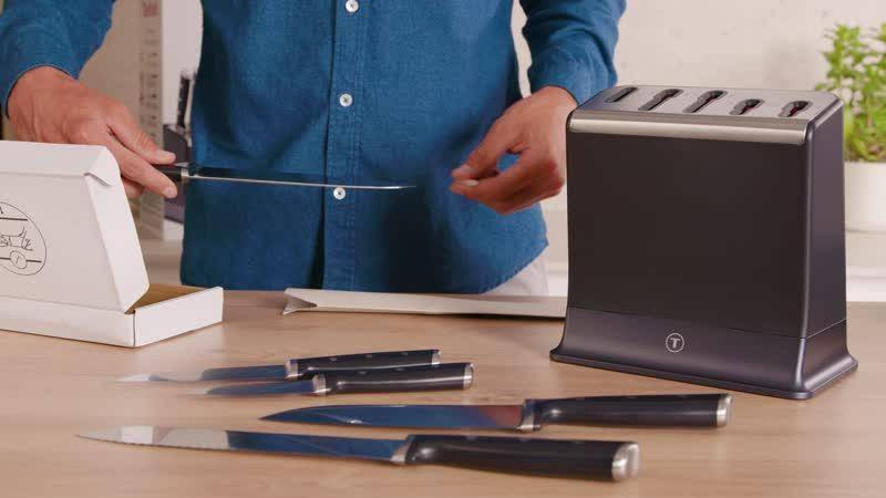 Una experiencia de cocina totalmente nueva y superplacentera: unos cuchillos de cocina siempre listos, precisos y afilados. Día tras día, año tras año. El set de cuchillos de 6 piezas de acero inoxidable EverSharp de Tefal integra un sistema de afilado patentado dentro del bloque de cuchillos. Basta con guardar el cuchillo dentro del bloque después de usarlo y estará afilado de nuevo, con una presión óptima y constante para ofrecer un afilado duradero que no podría ser más fácil de conseguir.