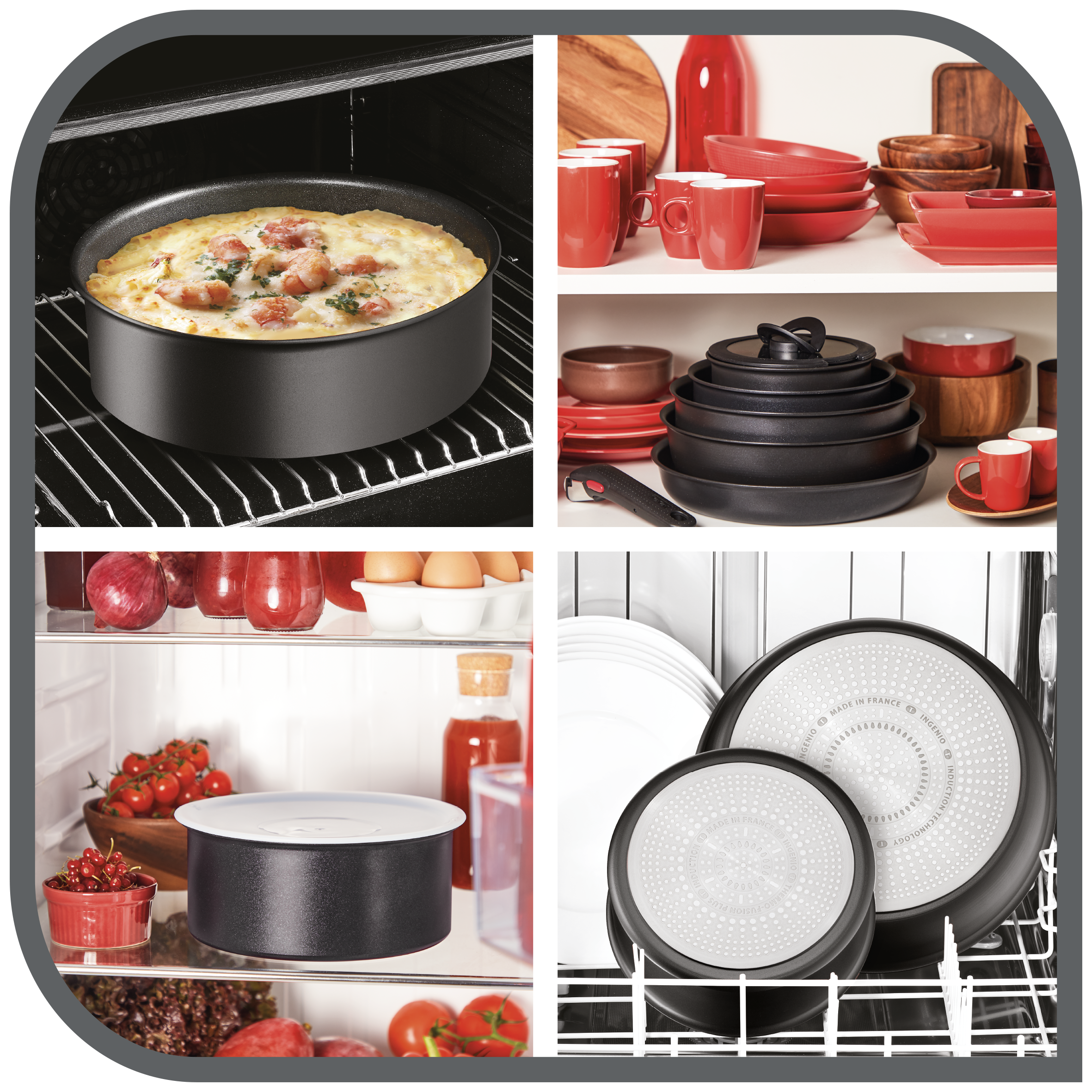 ¿Buscas simplificar tu vida? Ingenio de Tefal te trae la solución. Descubre las sartenes y cazos Ingenio con mango extraíble que te permitirán cocinar en el fuego, llevar directamente al horno, servir en la mesa y conservar la comida en la nevera, sin riesgo de quemaduras ni necesidad de ensuciar varios recipientes.Todo con un solo clic. Además, su diseño apilable permite un almacenamiento compacto en tus armarios que te ayuda a ahorrar mucho espacio en tu cocina y mantenerla ordenada en todo momento. Descubre la gama Ingenio Eco Resist, con su revestimiento antiadherente y antirrayaduras de titanio 6X, reforzado con cristal ultraduro y hasta 6 veces más duradero que el estándar de Tefal.Esta gama puede soportar incluso utensilios de metal, ofreciendo una durabilidad y resistencia excepcionales.