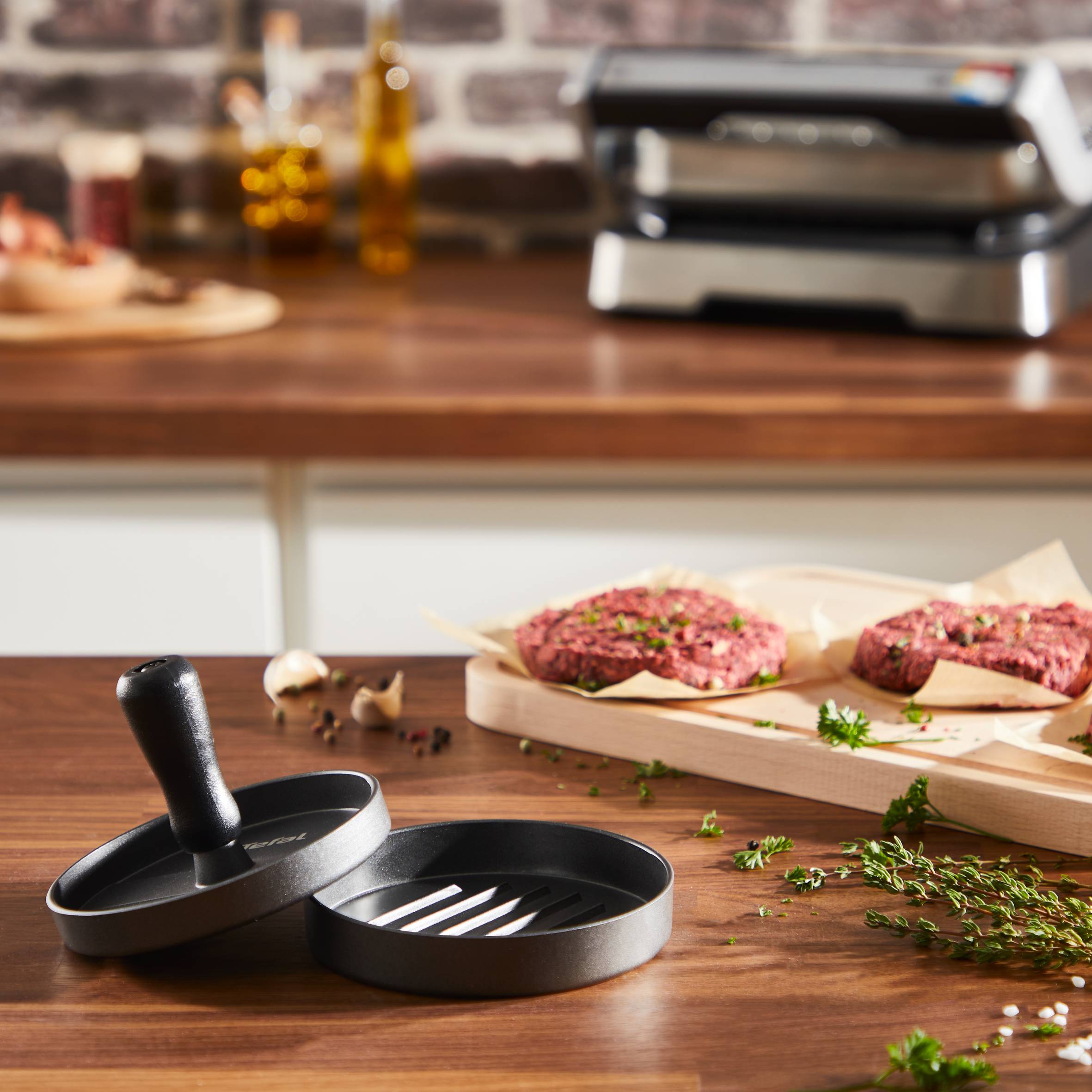 ¡Asa a la parrilla con Tefal! Nuestra colección de accesorios para asar te permite crear recetas espectaculares con facilidad. La prensa para hamburguesas, con revestimiento antiadherente y diseño apto para lavavajillas, forma hamburguesas perfectas de carne, pescado o verduras en dos pasos. Sus rebordes en la parte inferior crean un aspecto asado impresionante, sin importar cómo las cocines. Descubre toda la gama de accesorios Tefal para asar a la parrilla.