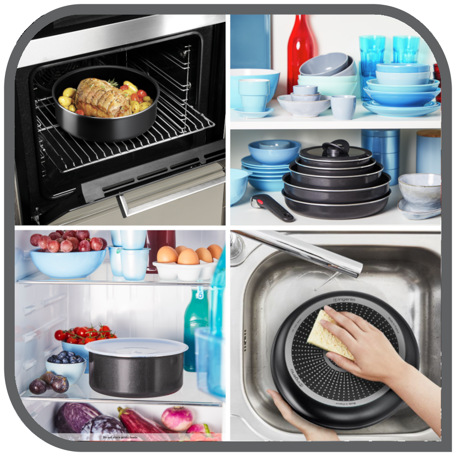Ingenio se hizo para simplificar la experiencia de cocinar en casa. Enciende la cocina, enciende el horno y desliza las sobras directamente en el refrigerador* con un elegante asa extraíble que es mucho más que un dispositivo: sistema de seguridad de 3 puntos ultraseguro, capaz de manejar pesos de hasta 10 kg** y protegido por nuestra garantía de 10 años***. Ingenio ahorra tiempo y energía en la cocina todos los días. El nuevo set Ingenio Easy Cook & Clean produce excelentes resultados sin complicaciones. Descubre los utensilios de cocina totalmente revestidos, por dentro y por fuera para una limpieza suave y sin dolor que no podría ser más fácil. El revestimiento de titanio de alta calidad se construyó para durar, mientras que una base de difusión produce una distribución óptima del calor para que los alimentos se cocinen uniformemente. Ya sea que se trate de platos de todos los días hechos desde cero o de un placer de fin de semana para satisfacer a toda la familia, no hay atajos para crear una cocina casera deliciosa. Tefal ofrece utensilios de cocina para acelerar el proceso de limpieza, dándole más tiempo para concentrarse en lo que cuenta.