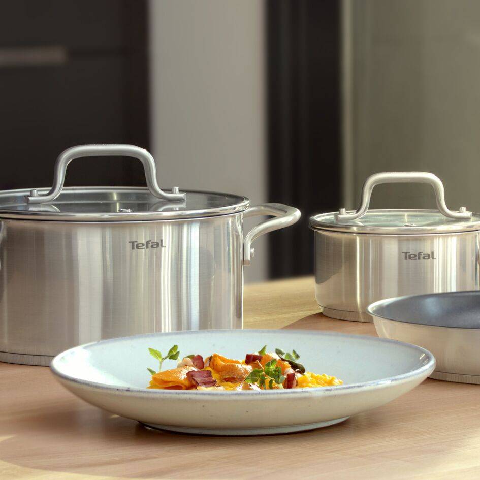 RESULTADOS DELICIOSOS: este juego de ollas esencial es idóneo para guisar, estofar y cocer y cocinar a fuego lento MANGO EXTRAÍBLE: mango resistente y sin hendiduras, para un fácil manejo y mayor seguridad mientras cocinas ÓPTIMA DIFUSIÓN DEL CALOR: gruesa base de 3 capas compatible con todo tipo de cocinas (gas, eléctrica, cerámica e inducción), para proporcionar una difusión del calor uniforme y un rendimiento duradero MARCAS DE MEDICIÓN: diseño inteligente con marcas de medición incorporadas que garantiza un llenado óptimo para conseguir mejores resultados en cada uso TAPA DE VIDRIO: la tapa de cristal acelera el tiempo de cocción y facilita el control COMPATIBILIDAD TOTAL: compatible con cocinas de gas, eléctricas, cerámicas y de inducción TEFAL, N. º 1 DEL MUNDO: Tefal, la marca n.º 1 del mundo en menaje de cocina (Fuente: Euromonitor International Limited, edición Home and Garden 2023, valor de la marca en ventas (PVP), datos de 2022], garantiza unos resultados óptimoss uso tras uso ACERO INOXIDABLE CON 10 AÑOS DE GARANTÍA: rendimiento y fiabilidad de larga duración, descubre un producto de calidad superior con un diseño resistente ¿QUÉ HAY EN LA CAJA? Cazo 16 cm + tapa 16 cm, cacerolas 18/20/24 cm + tapas 18/20/24 cm, olla para pasta 22 cm + tapa 22 cm