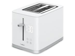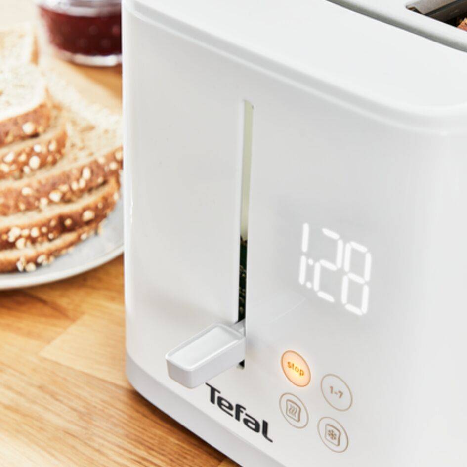 Pantalla digital perfecta: tostadora blanca con cuenta atrás digital minimalista y fácil de leer, para que controles el dorado con precisión 4 funciones específicas con botones táctiles: 7 niveles de tostado, parada, funciones de descongelación y recalentamiento Ranura ancha variable: para un centrado automático del pan: ideal para rebanadas tanto finas como gruesas Palanca de extracción para extraer las tostadas con facilidad: extrae fácilmente hasta el trozo de pan más pequeño Bandeja extraíble: para facilitar y acelerar la limpieza